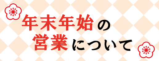 年末年始の営業につきまして下記の通りご案内申し上げます。12/28(日)~1/5(月)は年末年始のため、お休みさせて頂きます。